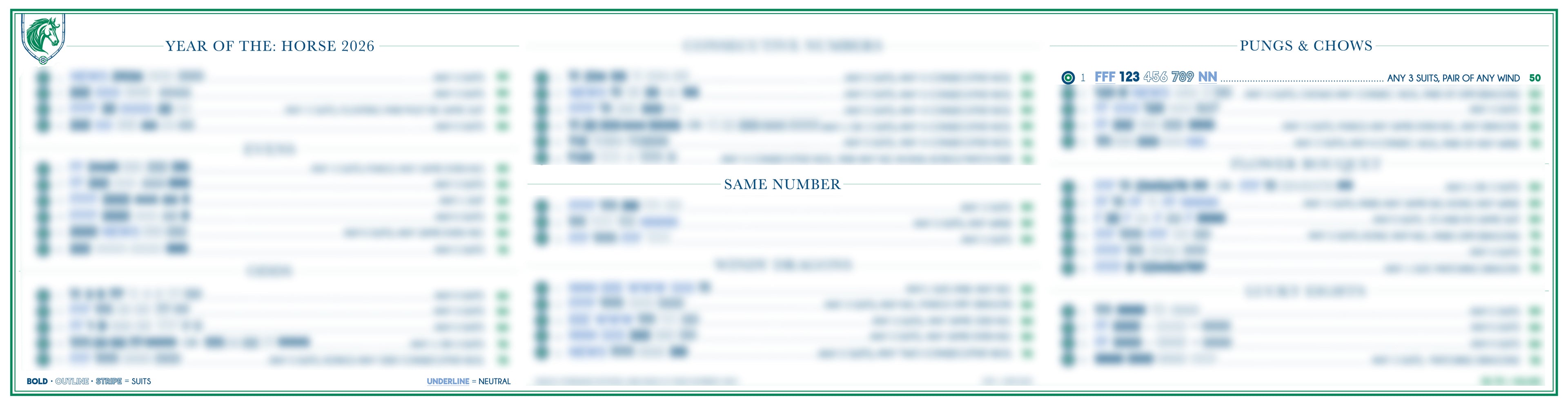 In creating this card, we set out to bring together the very best elements of global Mahjong traditions. We drew inspiration from Wright-Patterson’s revered publication, released every five years, giving a nod to terminals 11’s and 99’s, and one day hope to incorporate their beloved flower bouquet bonus — awarding extra points for numbered 1–4 flowers. At the same time, we’ve honored signature aspects of Riichi play from Japan, as well as the classic Pungs and Chows found in traditional Chinese Mahjong. The result is a thoughtfully blended card that celebrates Mahjong’s rich cultural heritage and unites players across styles and borders.